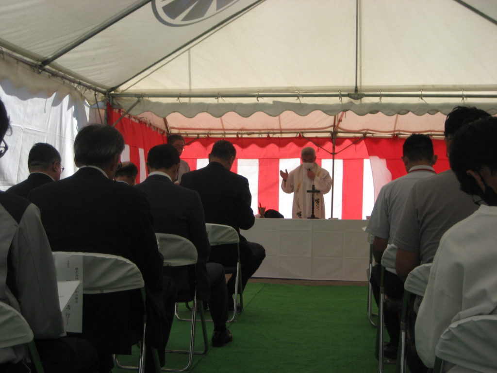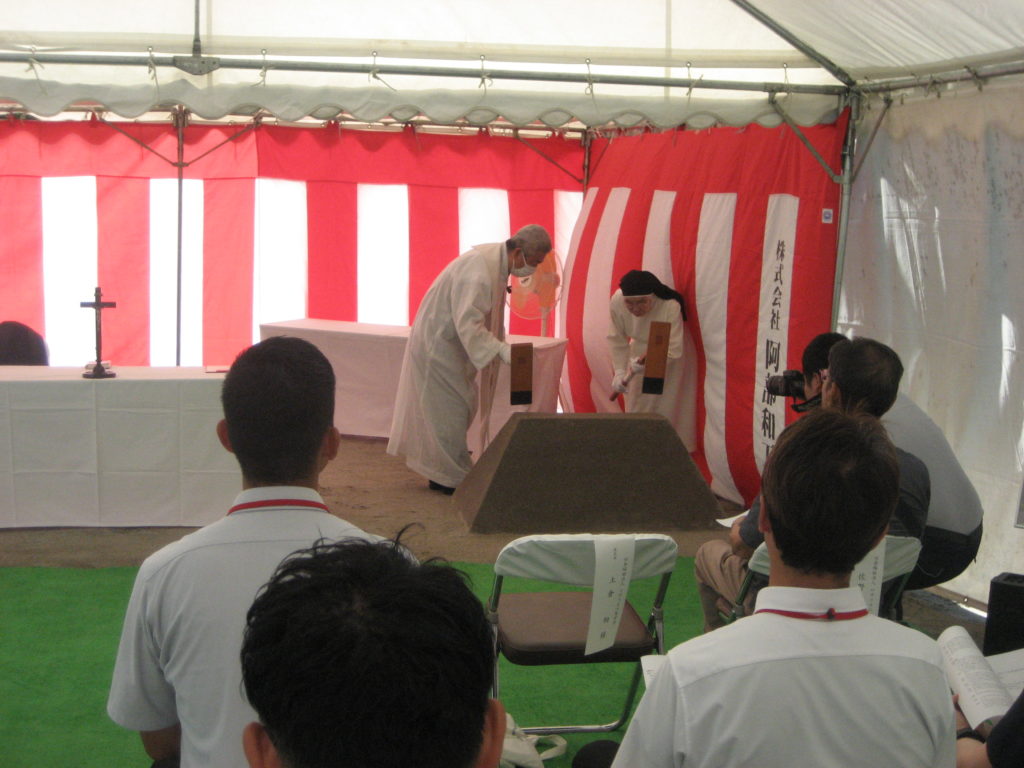 今年度の事業計画として予定していた地域小規模児童養護施設新築工事の担当業者様が、一般競争入札を経て阿部和工務店様に決定し、8月8日、工事契約が結ばれました。その後、建築予定地において地鎮祭が執り行われました。工事は8月9日から開始され、令和8年3月の完成を目指します。神父様から、新しく建てられる建物は、ハウスではなく、子どもたちが安心して暮らし、職員からの愛情を受け、健やかな成長を育んでいくホームになることを願っているとお話がありました。阿部和工務店の皆さんが愛情をもって素敵なマイホームを建築して頂けることに大変感謝しております。